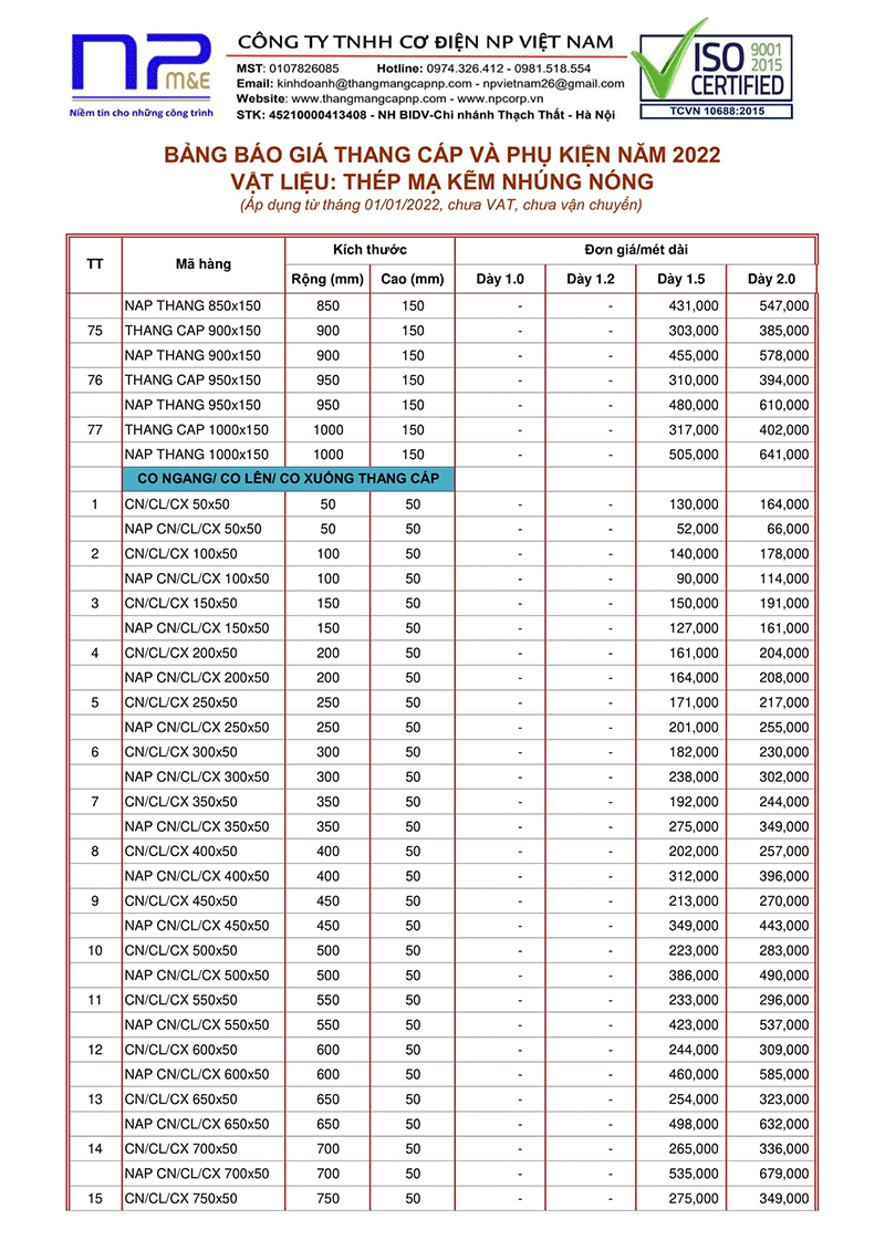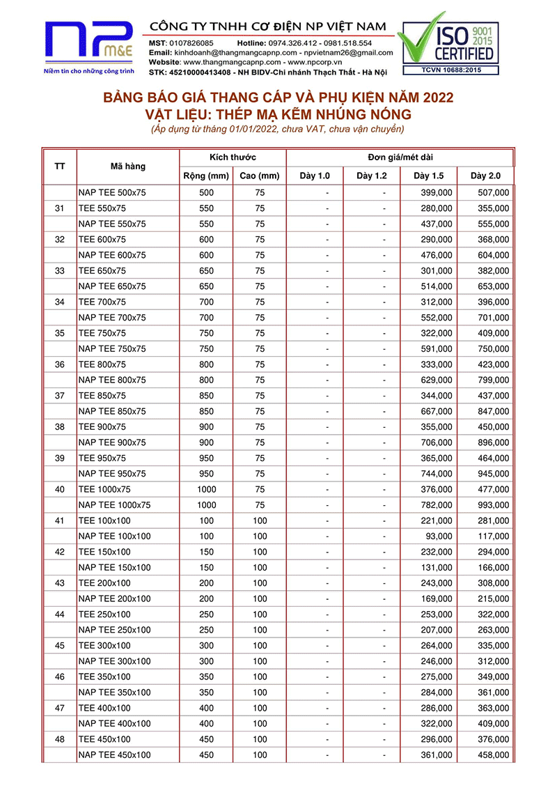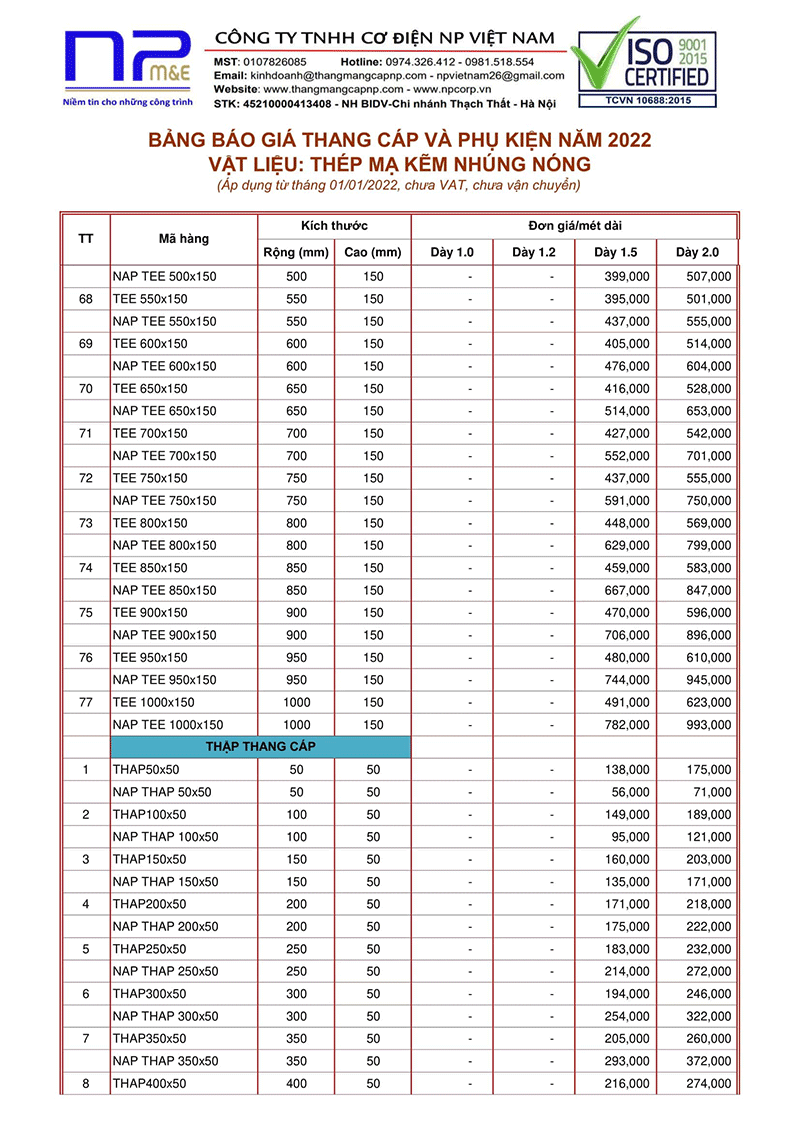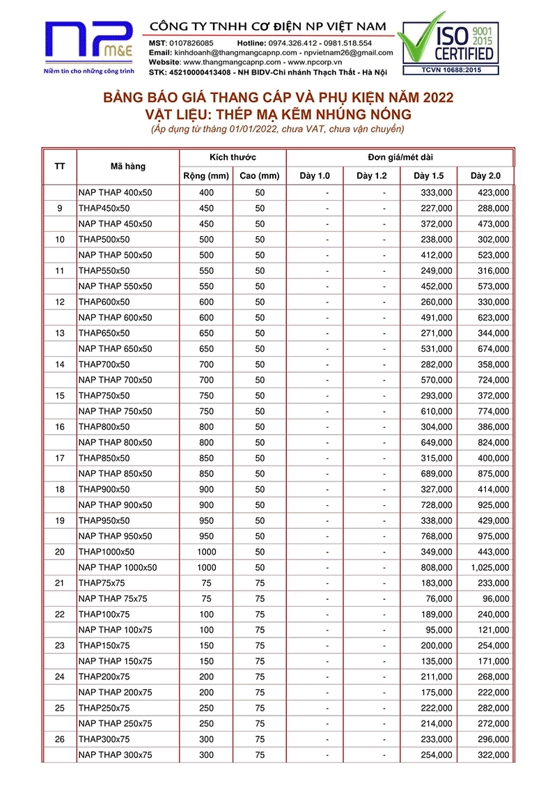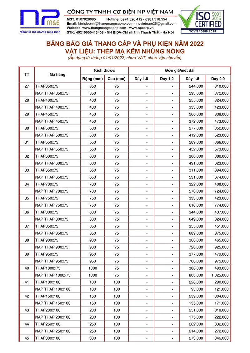 NP Việt Nam trân trọng gửi tới Quý khách hàng bảng báo giá thang cáp và phụ kiện mạ kẽm nhúng nóng giá cạnh tranh nhất năm 2022, cùng một số chính sách dịch vụ và bảo hành tốt nhất thị trường hiện nay: