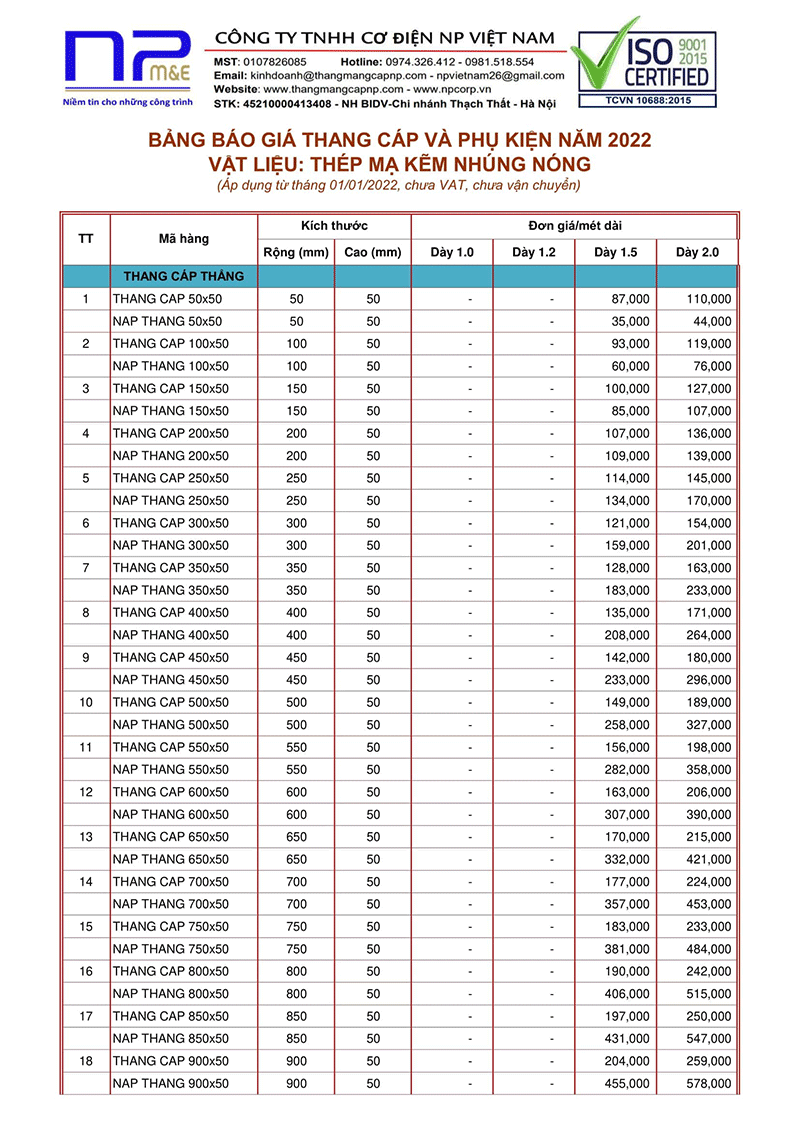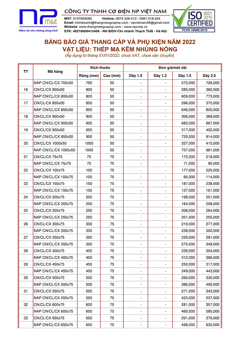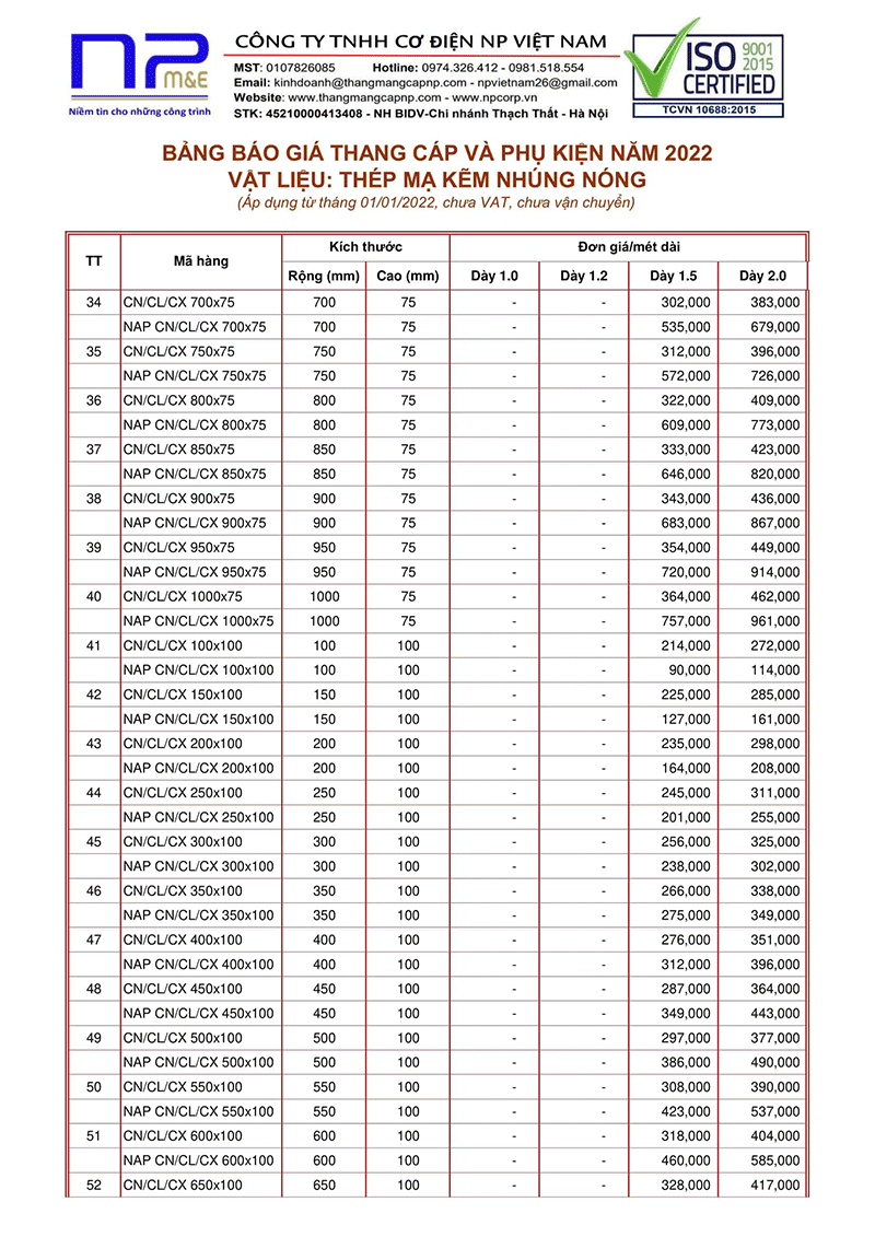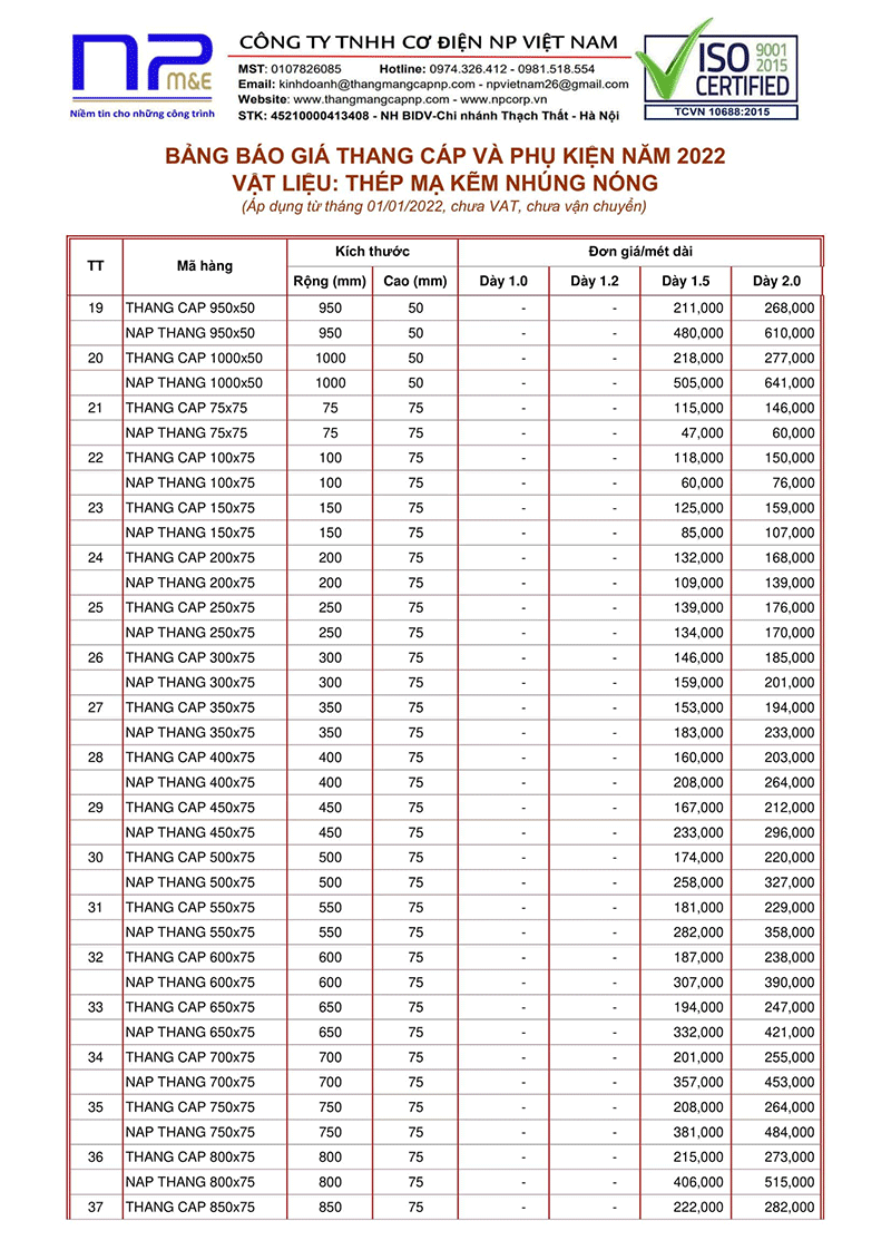 NP Việt Nam trân trọng gửi tới Quý khách hàng bảng báo giá thang cáp và phụ kiện mạ kẽm nhúng nóng giá cạnh tranh nhất năm 2022, cùng một số chính sách dịch vụ và bảo hành tốt nhất thị trường hiện nay: