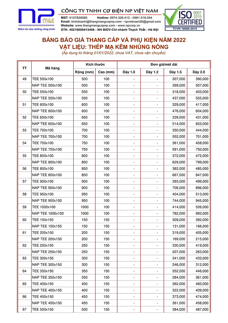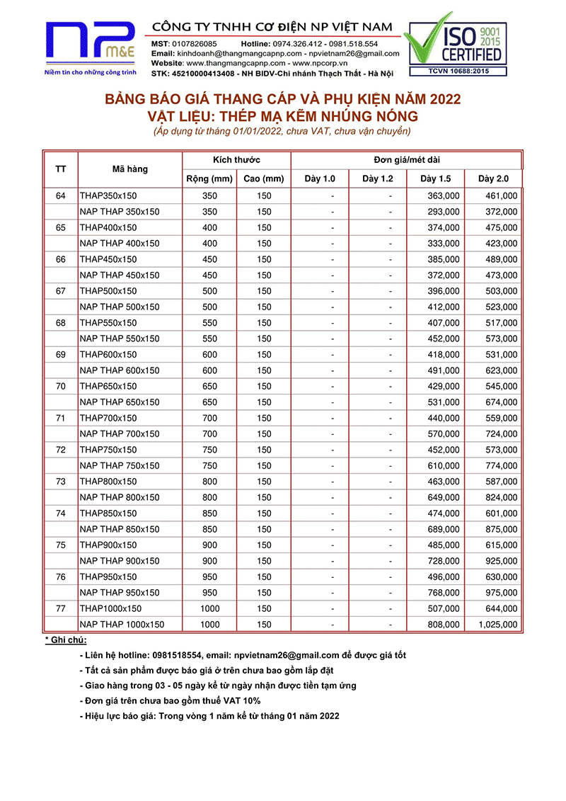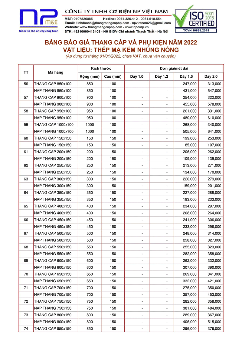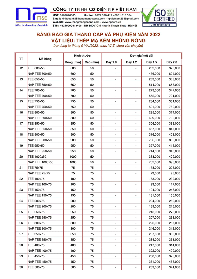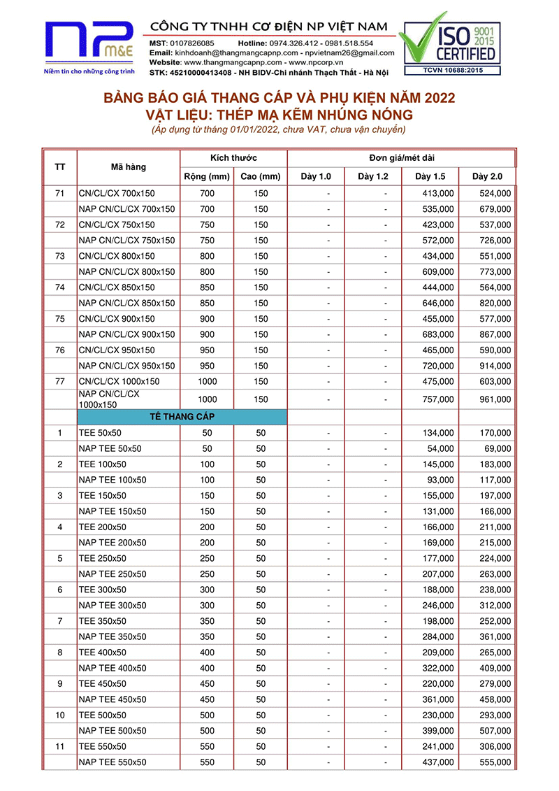 NP Việt Nam trân trọng gửi tới Quý khách hàng bảng báo giá thang cáp và phụ kiện mạ kẽm nhúng nóng giá cạnh tranh nhất năm 2022, cùng một số chính sách dịch vụ và bảo hành tốt nhất thị trường hiện nay: